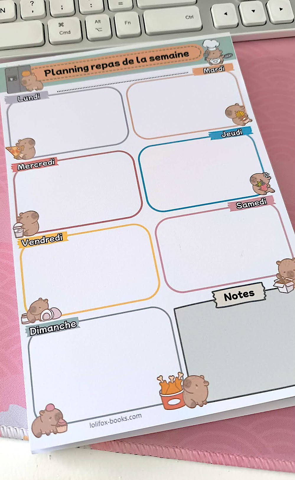 Ce bloc notes Capybara est là pour vous détendre et gérer le planning des repas sur plusieurs semaines et les fiches sont réutilisables pour créer des semaines de menus d’avance.